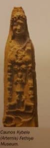 According to the people of Caunos, their ancestors had emigrated from Crete, according to Herodotus’ interpretation they may be natives of this land. In both cases, however, the most ancient deity they worshipped was the mother goddess, the origins of which go back to the Palacolithic Era. The monolith shown sometimes as a crudely hewn menhirand and sometimes as a schematized steep pyramid on the coins of Caunos, is the most widely spread cult object of the mother goddess. She reigned over birth and death, the balance of nature and the cycle of seasons as seen in the Cybele cults of other regions.